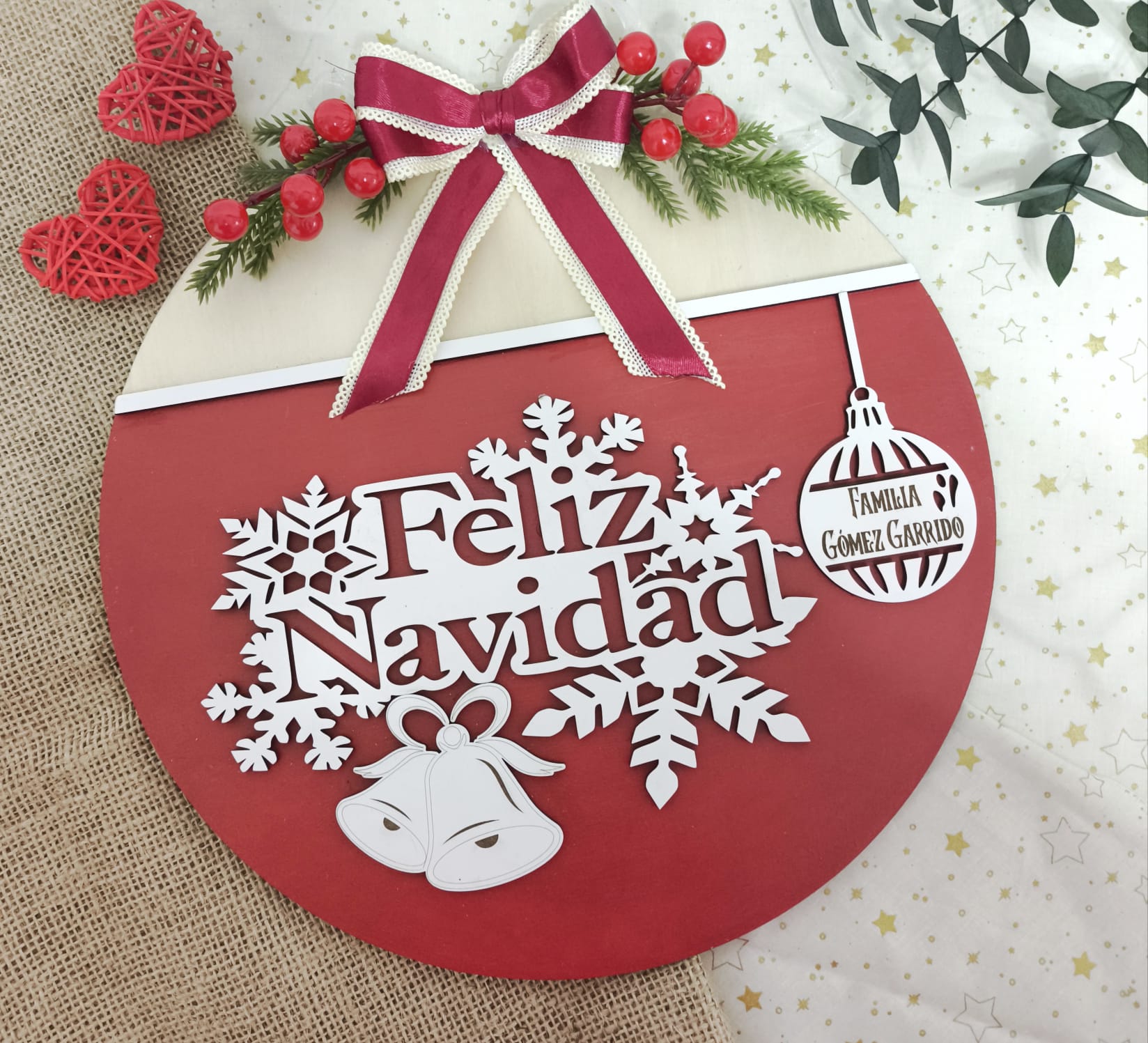 Personaliza el diseño con el nombre de tu familia (por ejemplo, Familia Gómez Garrido), creando un detalle único para la puerta de casa, el salón o la chimenea.