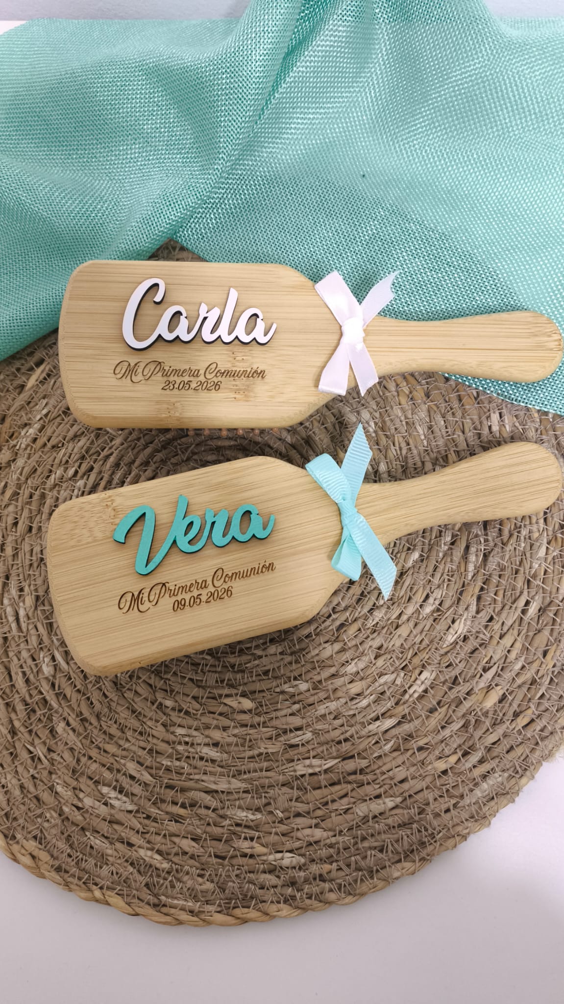 El cepillo de madera natural, también personalizado con el nombre y la fecha, completa el conjunto. Es un detalle práctico y a la vez emotivo, perfecto para los preparativos de ese día tan esperado.