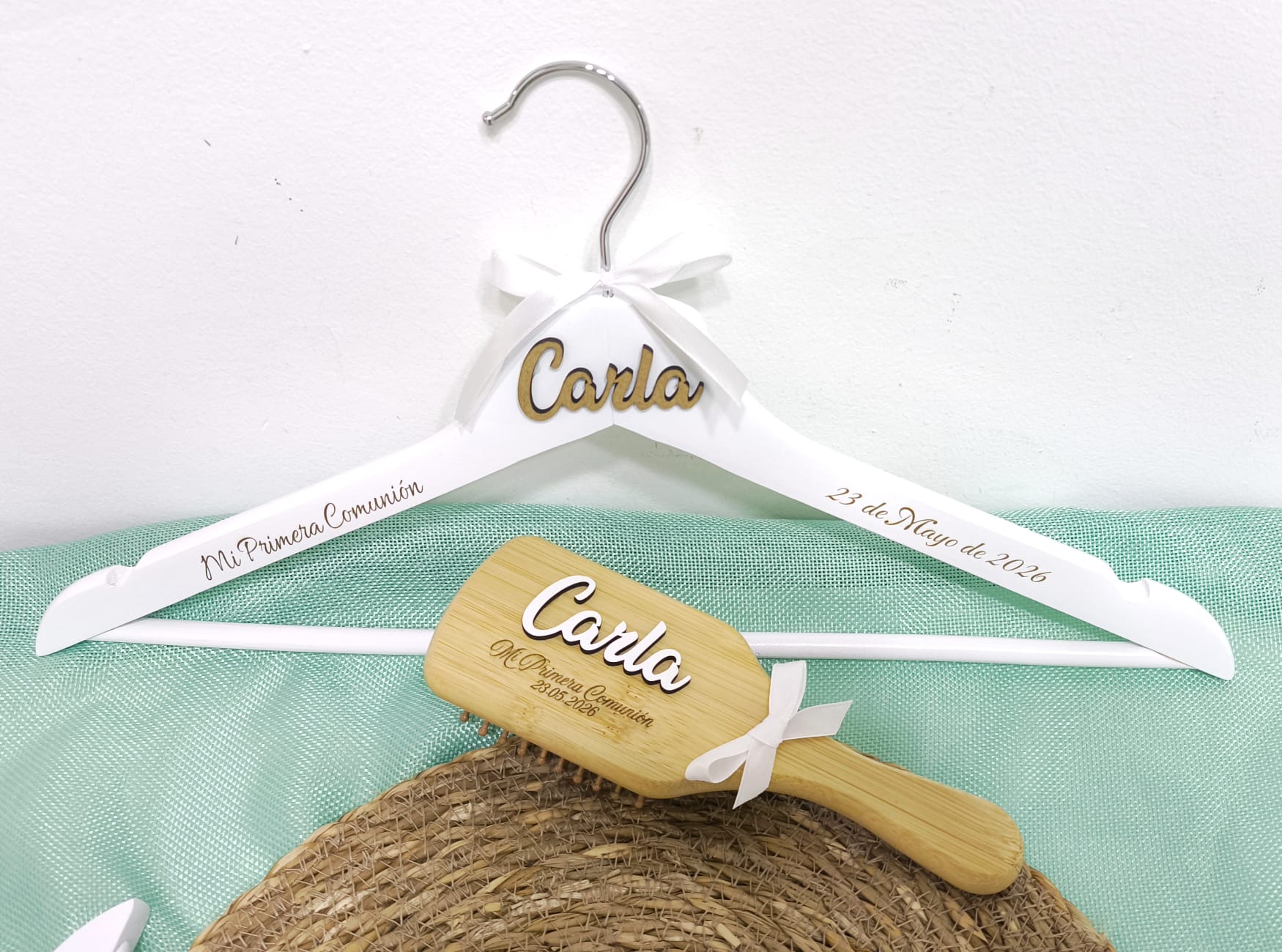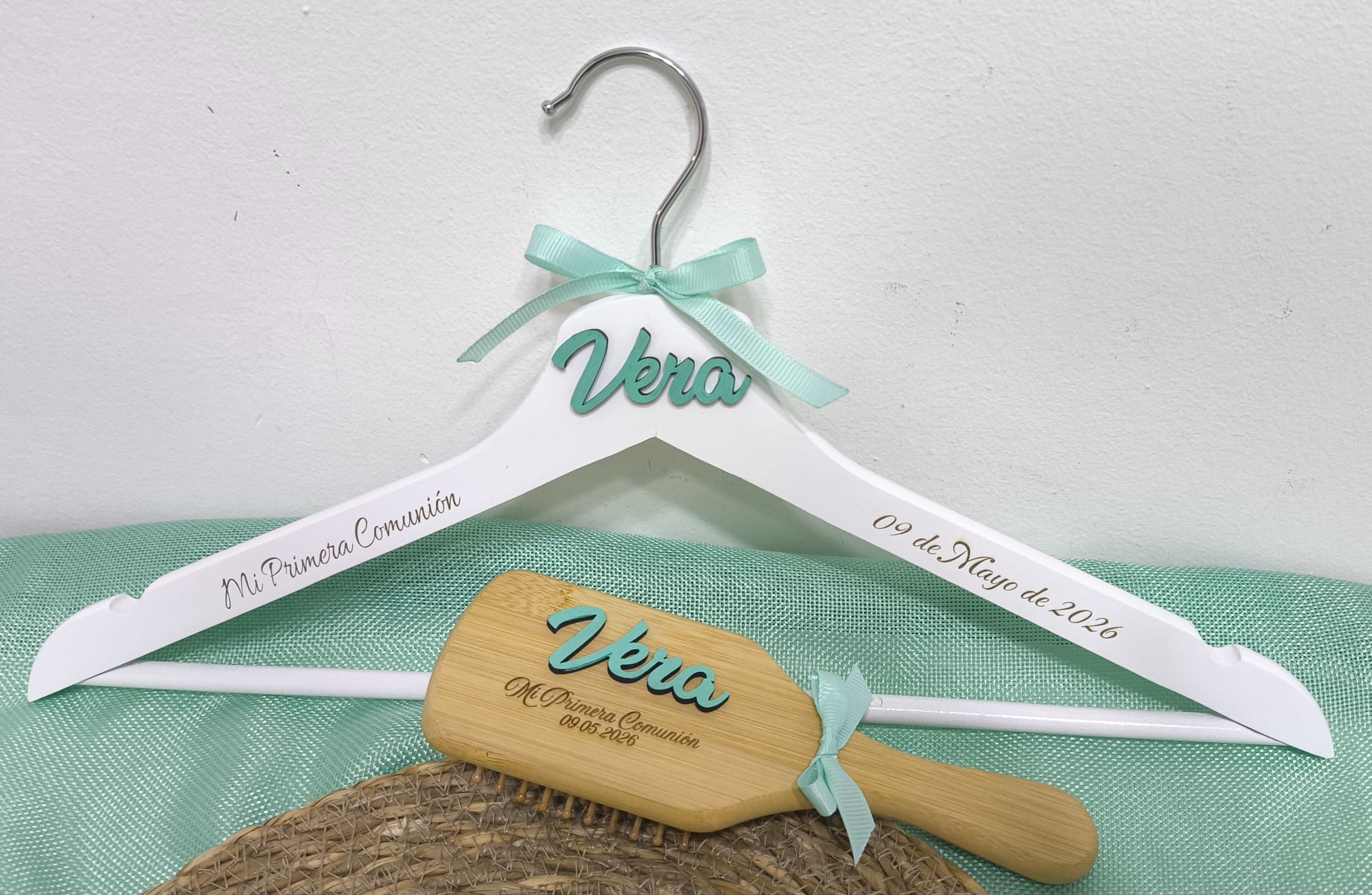 Hay detalles que acompañan momentos únicos. Nuestro conjunto de percha y cepillo personalizado para Primera Comunión está pensado para formar parte de ese día tan especial y conservarlo en el recuerdo para siempre.