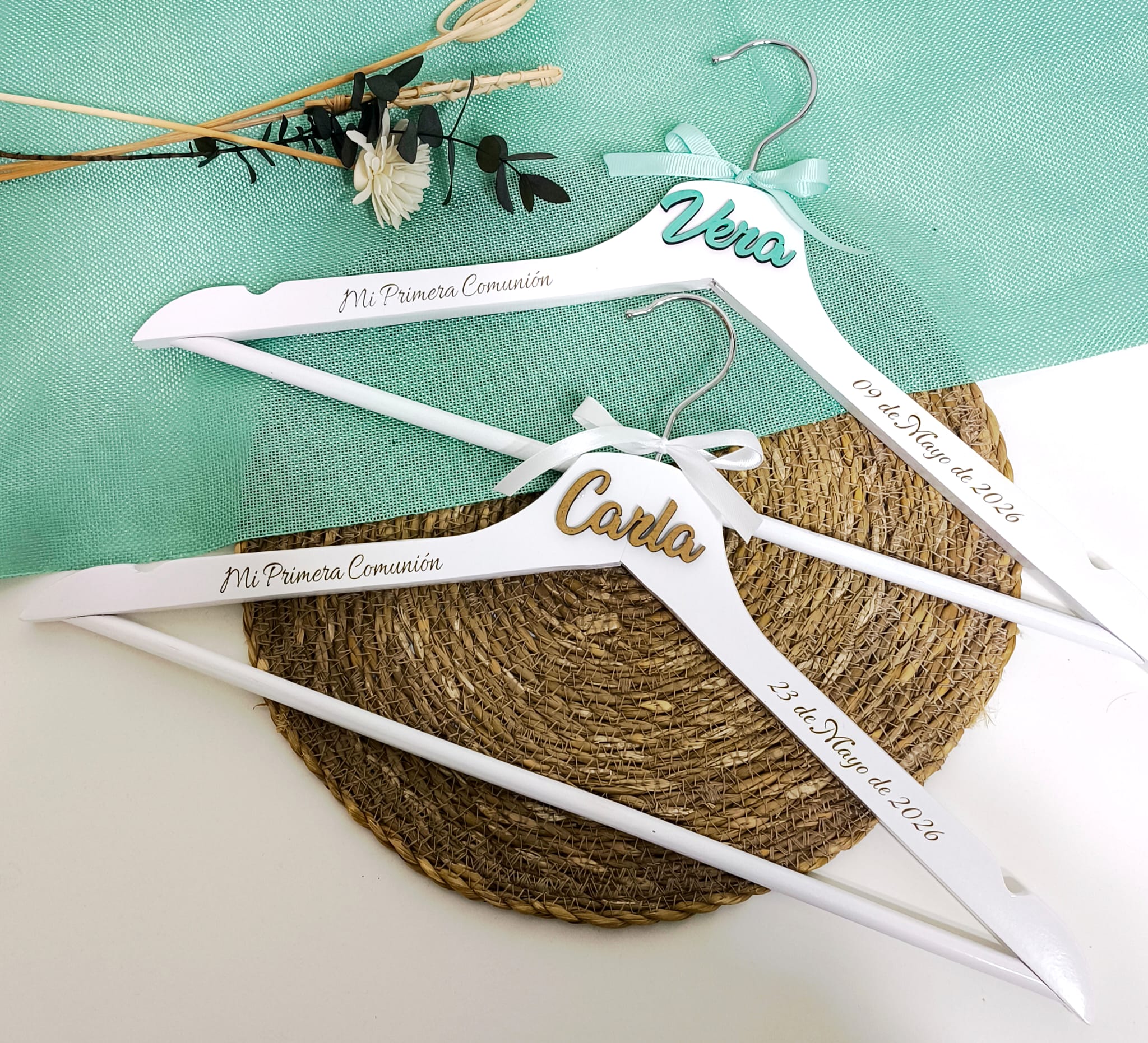 La percha de madera blanca se personaliza con el nombre del niño o la niña en relieve, acompañado de la frase “Mi Primera Comunión” y la fecha del evento. Un lazo delicado aporta ese toque dulce y elegante que luce precioso en las fotos del vestido o traje antes de la ceremonia.
