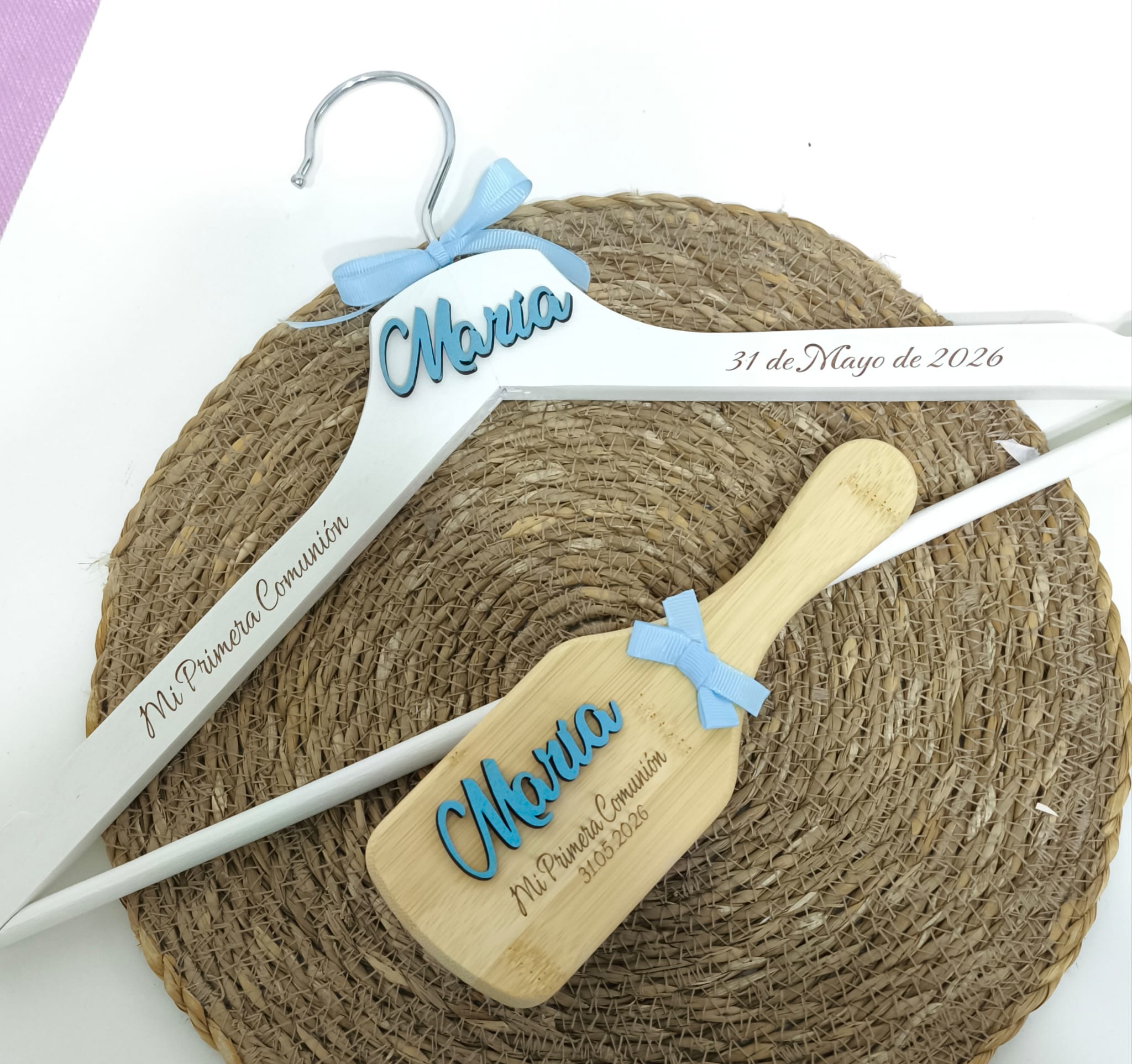 Hay detalles que acompañan momentos únicos. Nuestro conjunto de percha y cepillo personalizado para Primera Comunión está pensado para formar parte de ese día tan especial y conservarlo en el recuerdo para siempre.