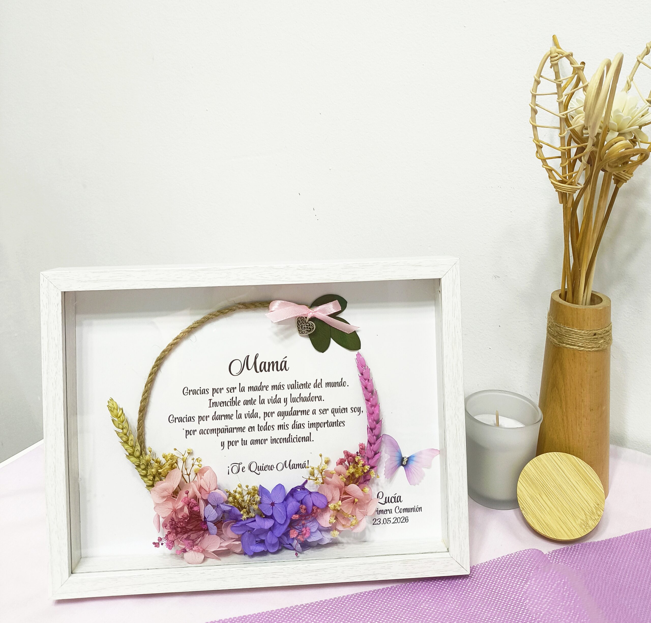 Los cuadros diseño Círculo con flores preservadas y frase son el regalo perfecto para tener un detalle en cualquier evento con las personas más importantes para ti. Son un detalle precioso que nos encanta trabajar y que puedes personalizar como necesites.