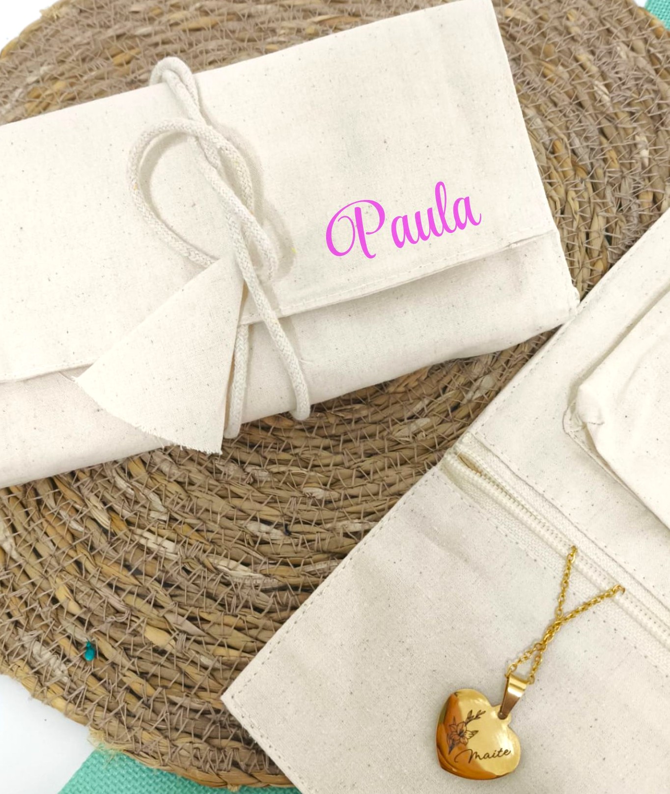 Joyero de algodón personalizado con nombre, perfecto para guardar collares, pulseras y anillos de forma ordenada. Diseño práctico, ligero y fácil de llevar, ideal para viaje o para casa. Un regalo personalizado bonito y funcional para cualquier ocasión.