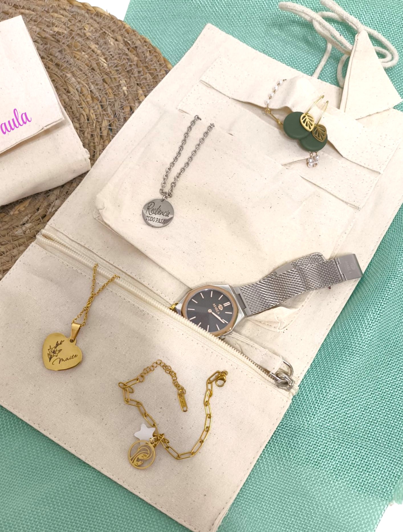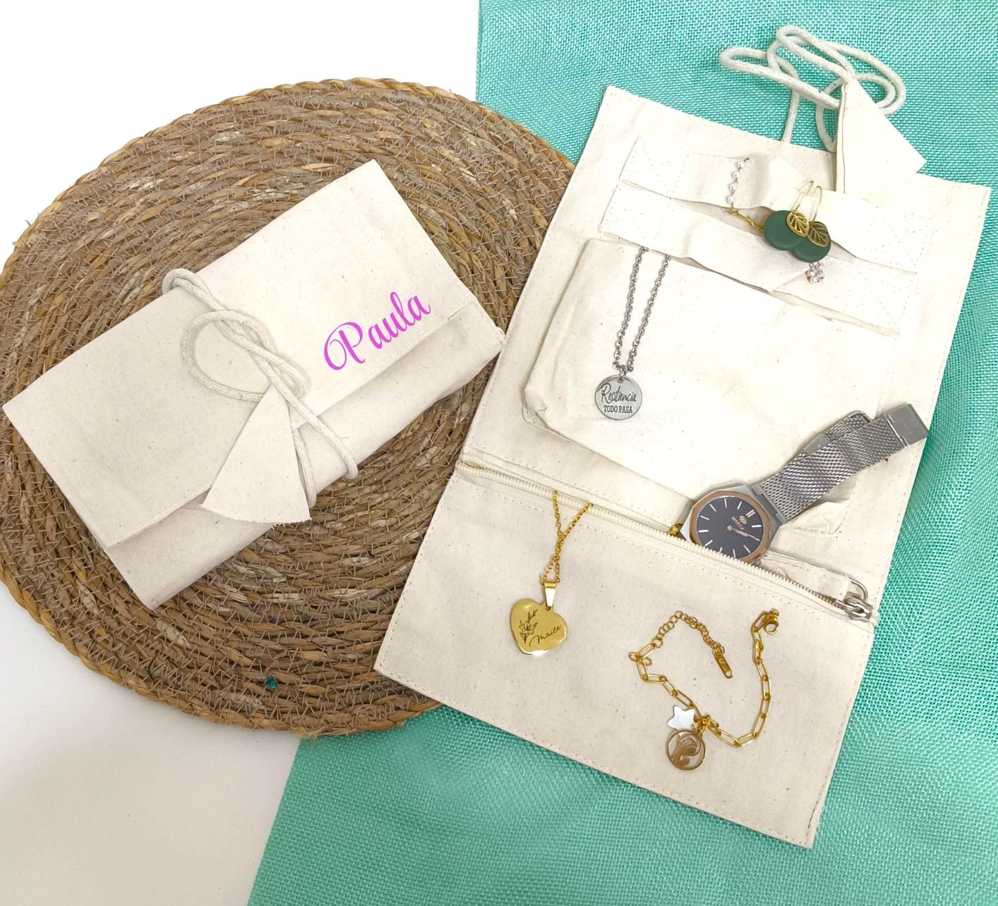 Confeccionado en algodón natural, su diseño desplegable incluye compartimentos interiores, bolsillo con cremallera y cintas para sujetar las piezas con cuidado y evitar enredos. Además, puedes personalizar la solapa con el nombre que elijas, convirtiéndolo en un detalle único y muy personal.