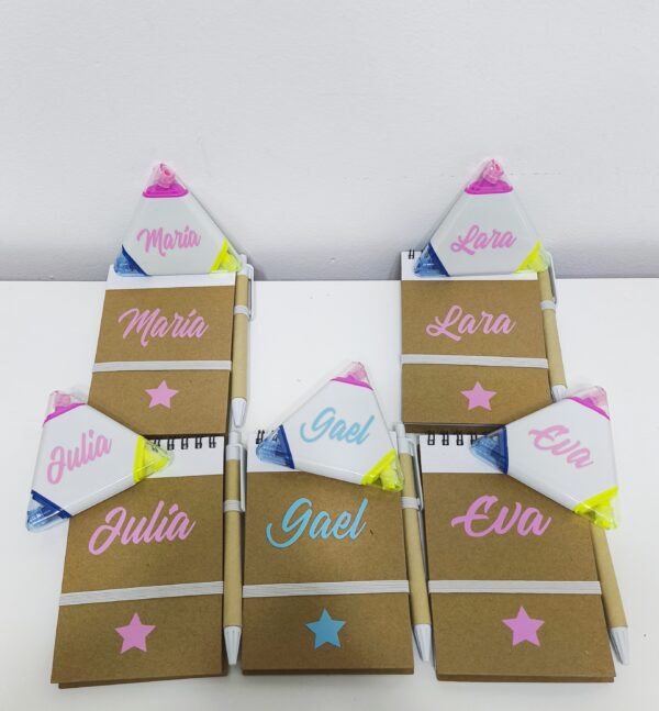 Pack muy completo compuesto de libreta personalizada, bolígrafo y marcador fluorescente de 3 colores , que podrás personalizar con el nombre de los invitados o con los datos del evento.