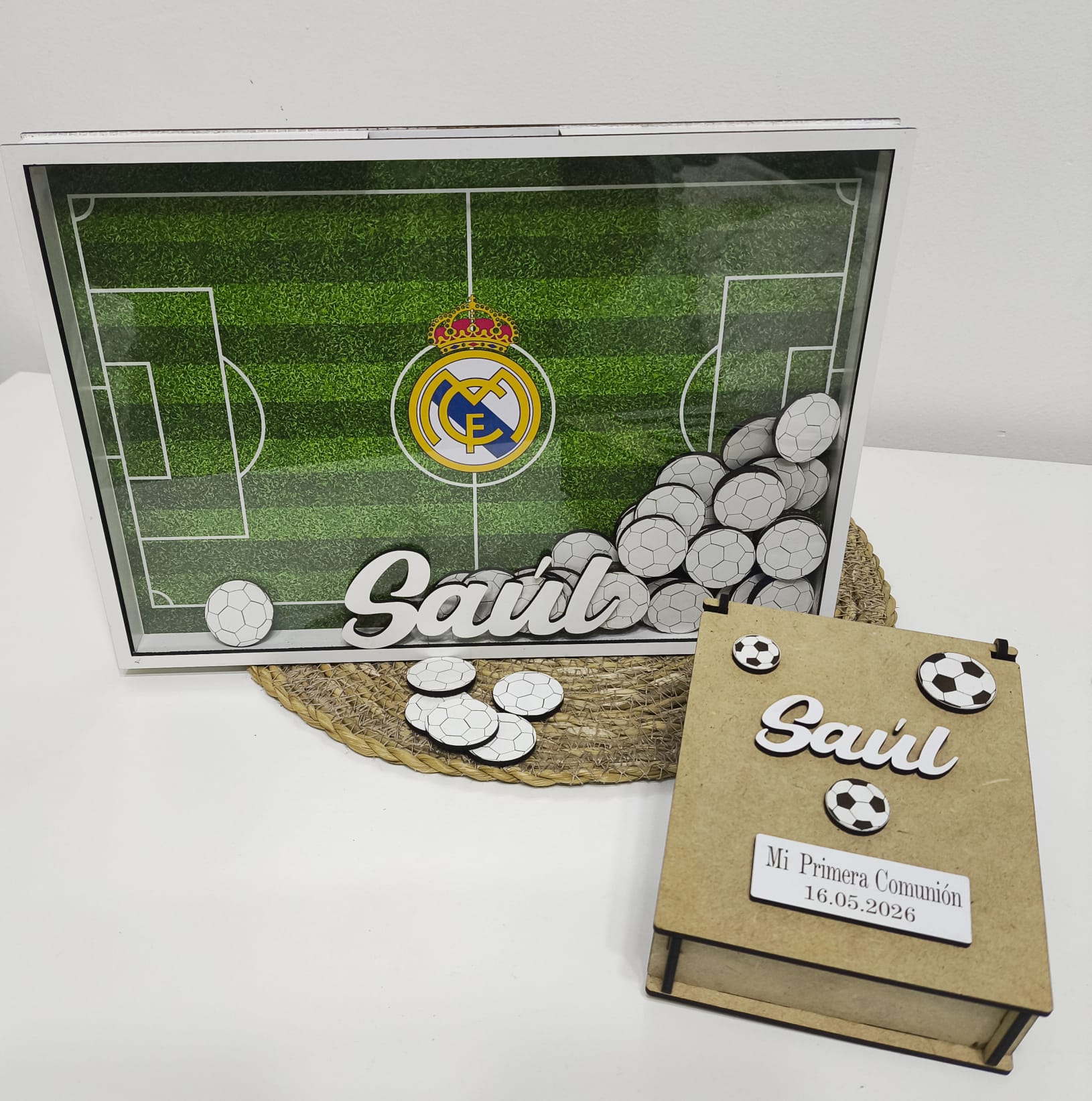 Incluye 35 fichas con forma de balón para que cada invitado deje su dedicatoria y una caja de madera personalizada donde guardarlas antes y después del evento. Tras la celebración, el marco se transforma en un bonito elemento decorativo lleno de recuerdos y cariño.