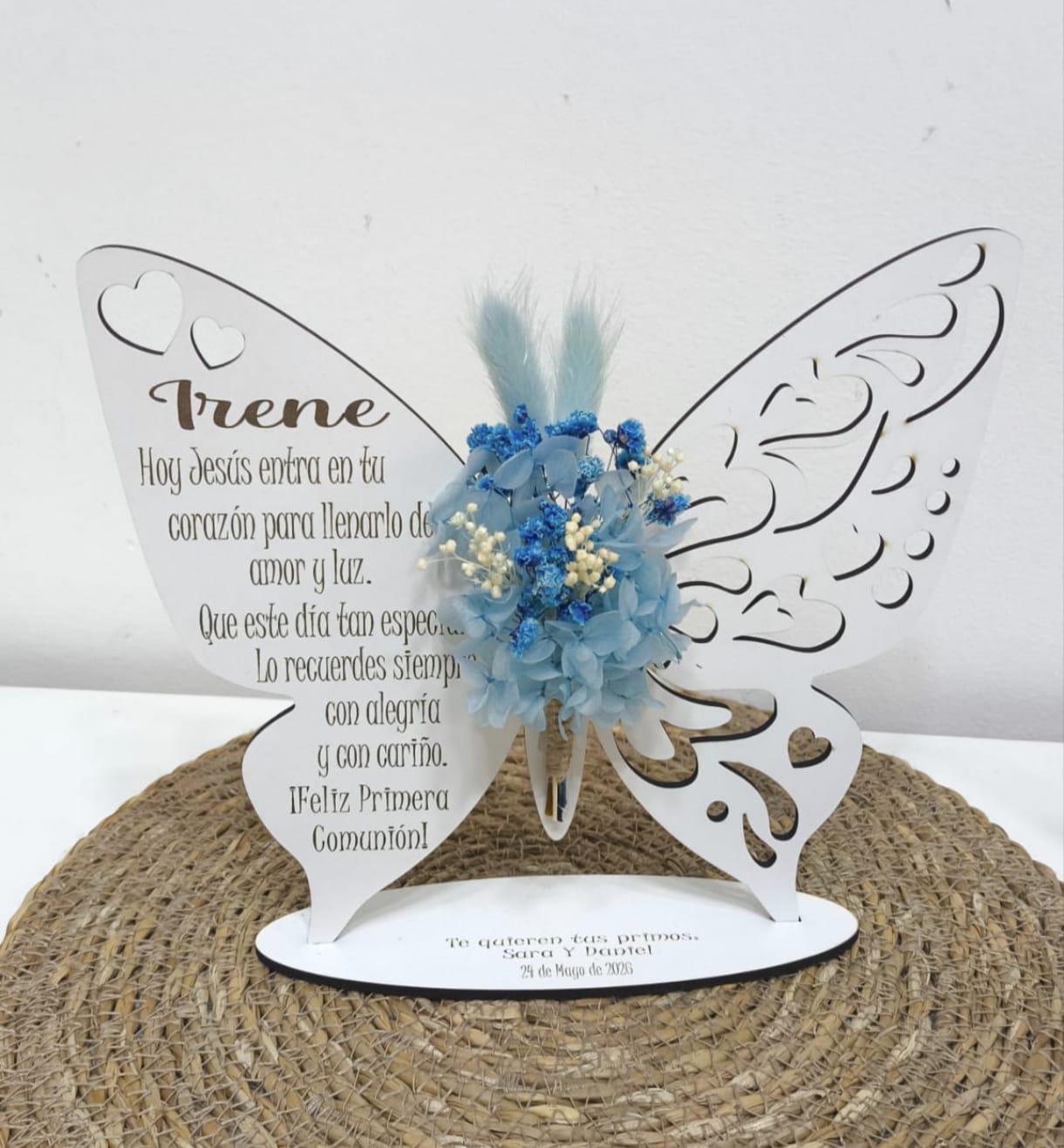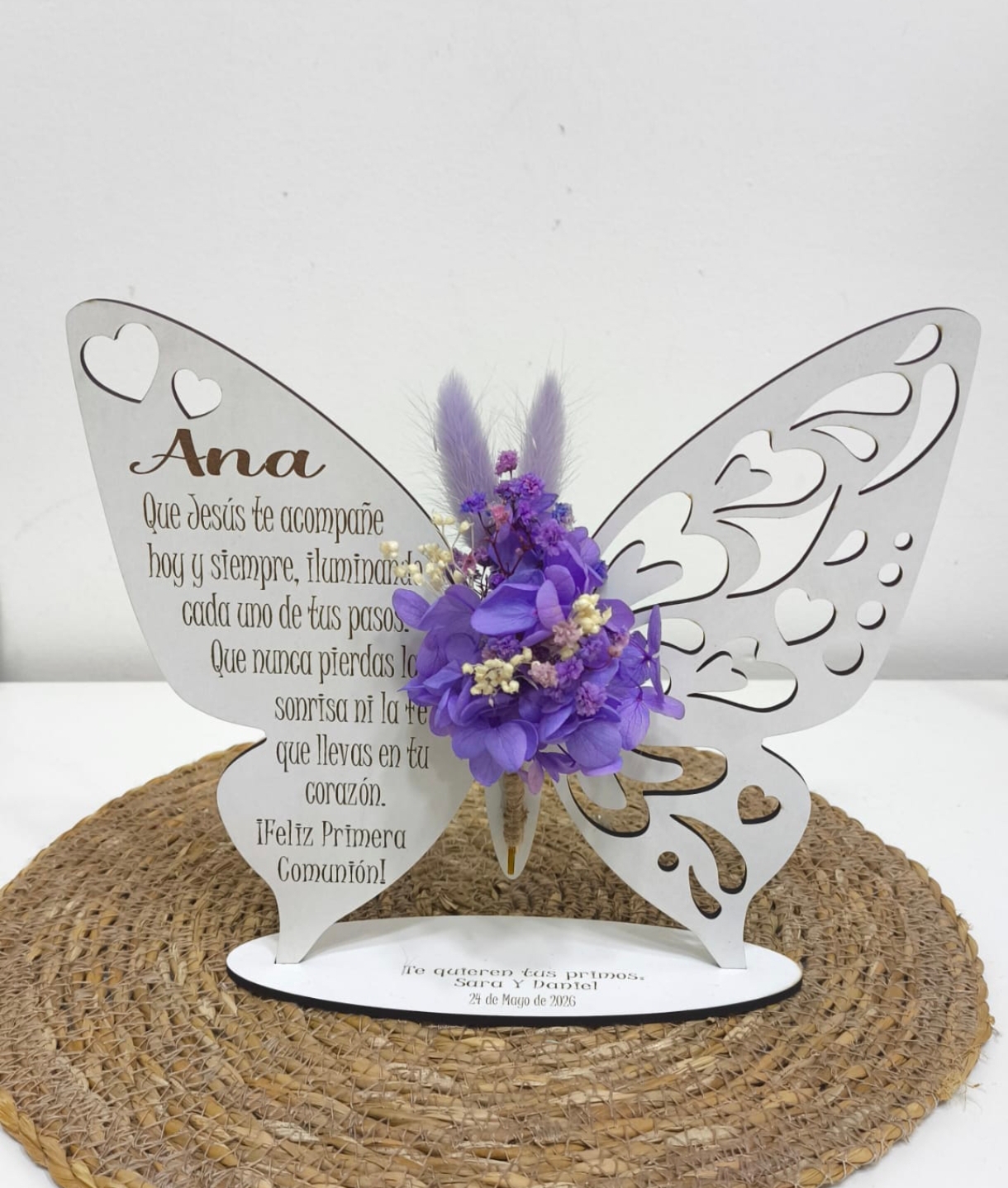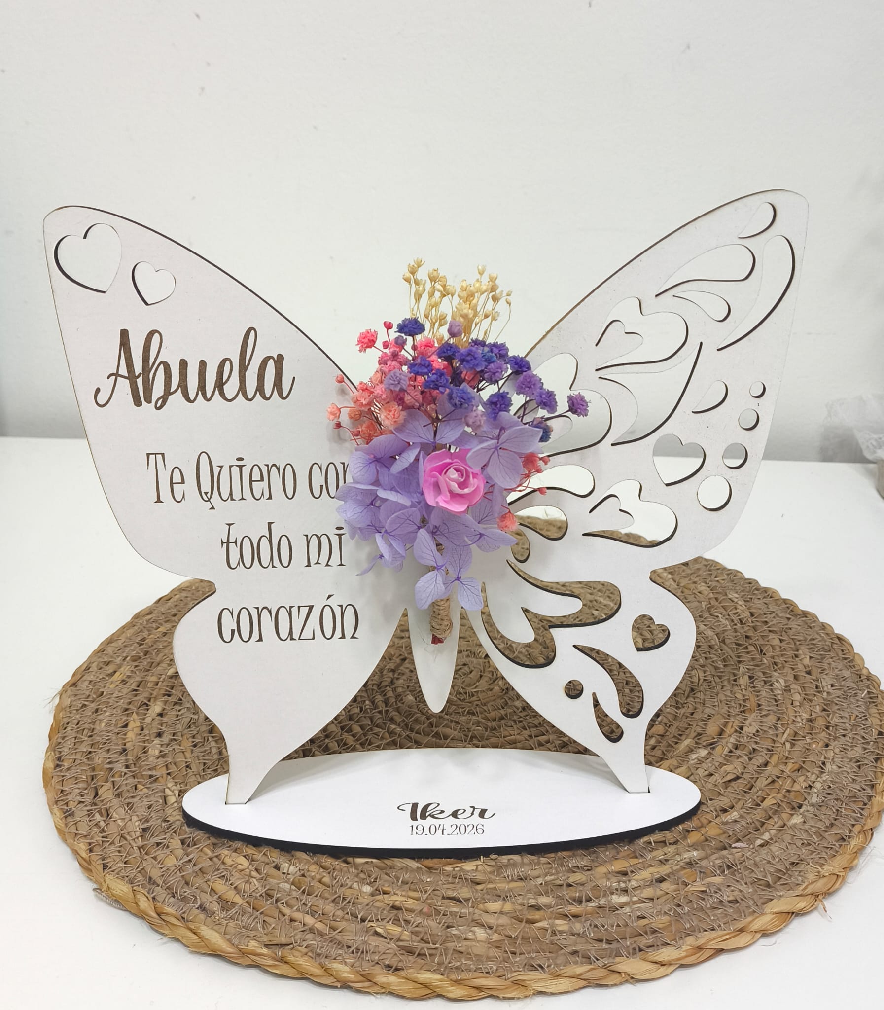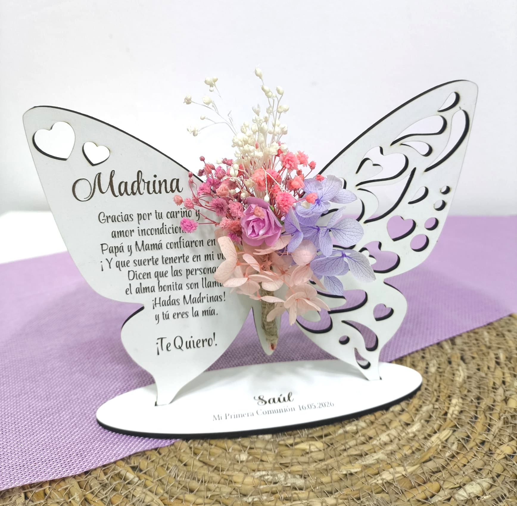 Haz que tu regalo sea inolvidable con nuestra peana en forma de mariposa personalizada, elaborada en madera calada y decorada con un delicado ramo de flores preservadas y secas en tonos naturales y duraderos.