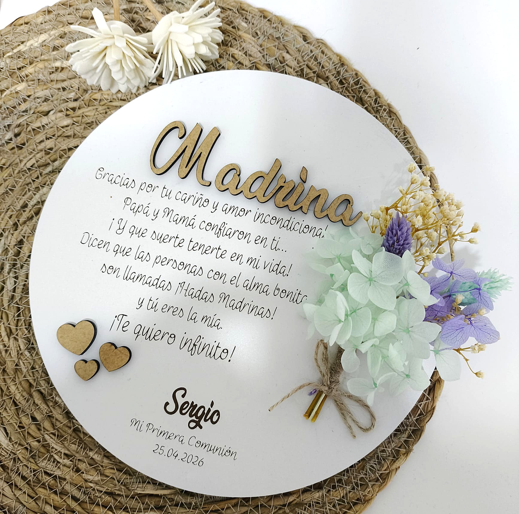 Haz un regalo único y lleno de amor con esta placa personalizada con ramito de flores preservadas, ideal para ocasiones especiales como Primera Comunión, bautizos, confirmaciones, cumpleaños o agradecimientos.