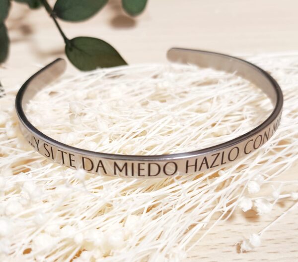 ... y si te da miedo hazlo con miedo es la frase de joya única para inspirarte cada día. Esta pulsera de acero inoxidable se puede personalizar con la frase que más te motive o signifique algo especial para ti (máximo 9 palabras). Ideal como regalo con mensaje o como recordatorio personal.